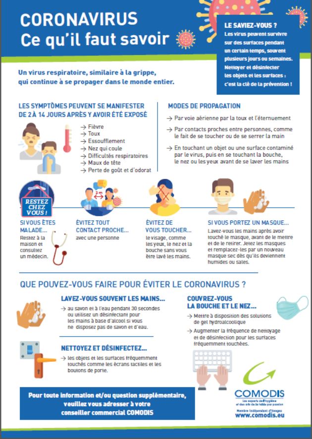Les autorités de la santé publique ont défini le CORONAVIRUS comme étant une pandémie mondiale. COMODIS fournit son expertise et ses conseils pour vous aider à lutter contre la propagation du COVID-19 dans votre activité et à assurer la sécurité de vos employés et de vos clients.